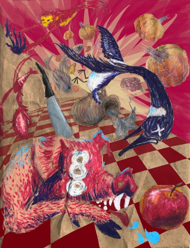 Pencil, pastel, and digital art on a paper bag